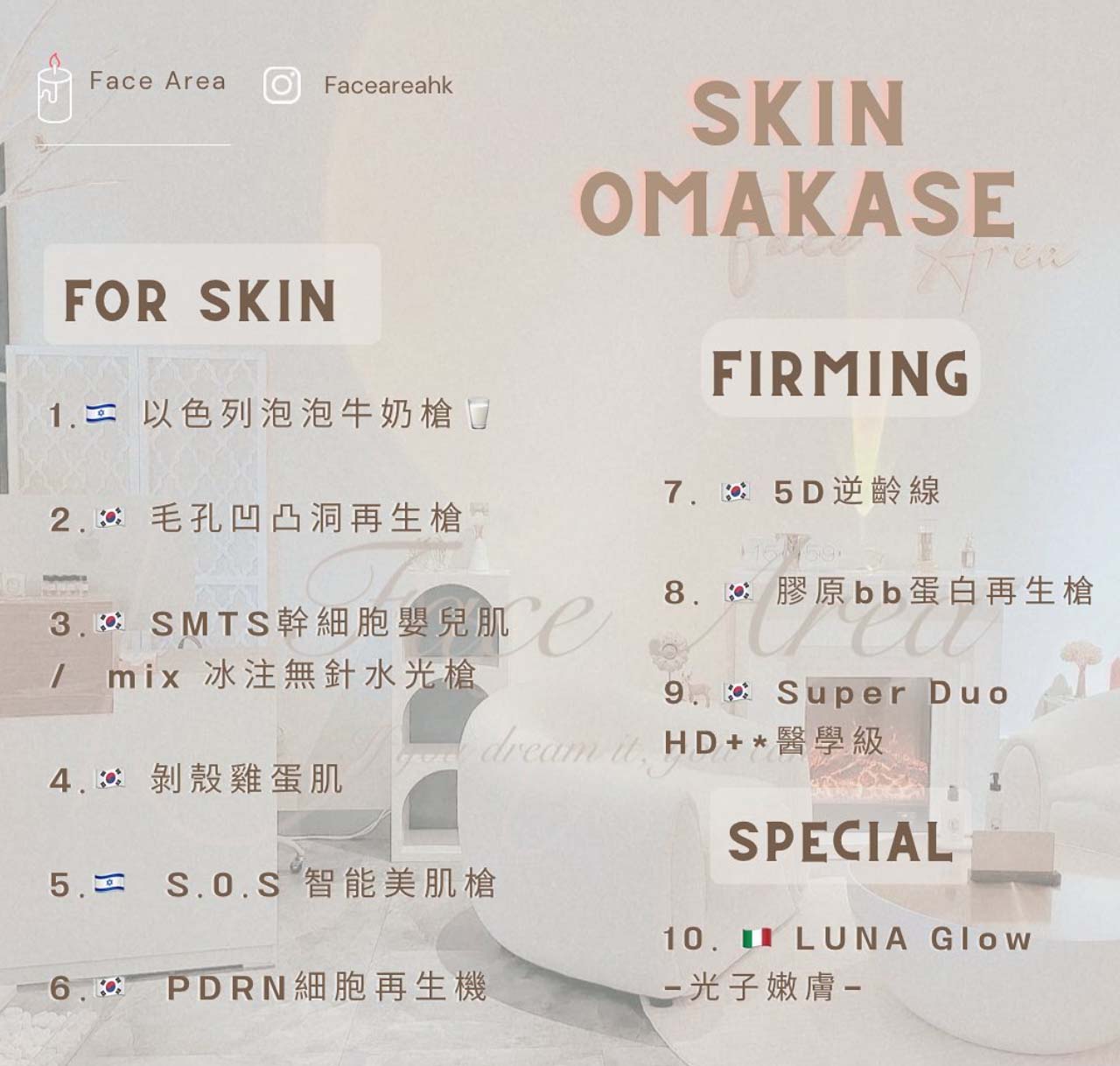 SKIN OMAKASE Skin Omakase Talior Made 高級訂制-每一款療程-每一滴精華-每一款面膜-每一個步驟專業規定根據您的肌膚狀況需要改善而配製 了解更多 Skin Omakase 我們賣的不是儀器,是整套療程及五星級的療程服務體驗會幫助您改善皮膚的醫美科技護理療程會幫助您改善皮膚的科技護理療程。每一個項目1-10 儀器只是主菜會根據你的皮膚再配合其他儀器作為 前菜 & 甜品🍮包括中途用的所有用料用法均量膚定制🫶🏻 🫶 療程對比圖 療程對比圖 療程好評 療程好評 專業諮詢 選擇療程—Please choose an option—Skin omakaseSuperDuoHD+Super Collagen 2.0一叮溶脂美白倉小顏療程 姓名 性別—Please choose an option—女男 電話 年齡—Please choose an option—18歲以下18-23歲24-30歲31-40歲40以上 Email 本人已閱讀並同意私隱政策及條款優惠細則。 本人不願意日後繼續收取 FACEAREAHK 之產品資料、宣傳資訊及推廣優惠。